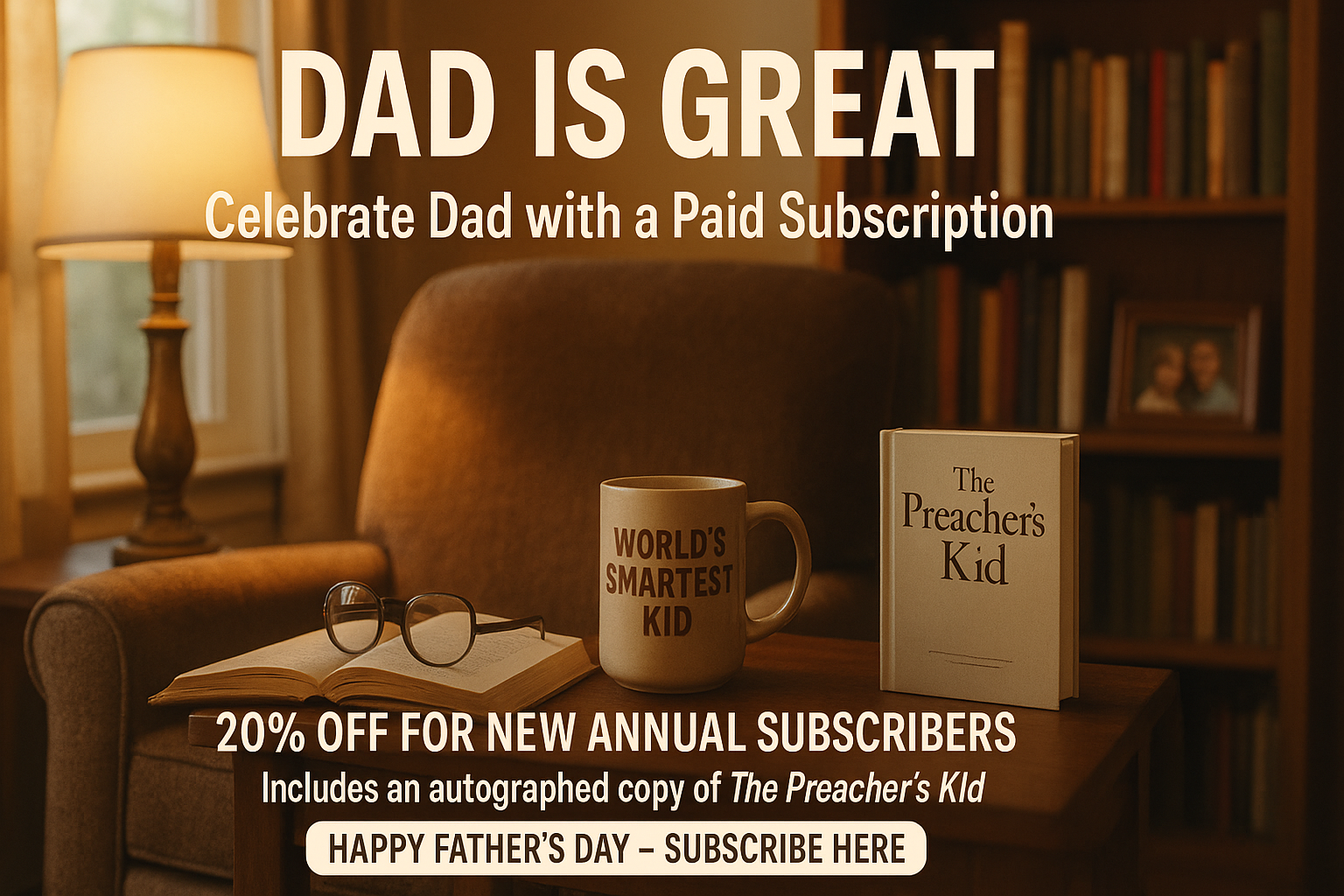Get 20% off of your own paid subscription and receive pre-release previews of my coming books. All annual subscribers receive an autographed copy of my first book, The Preacher’s Kid.