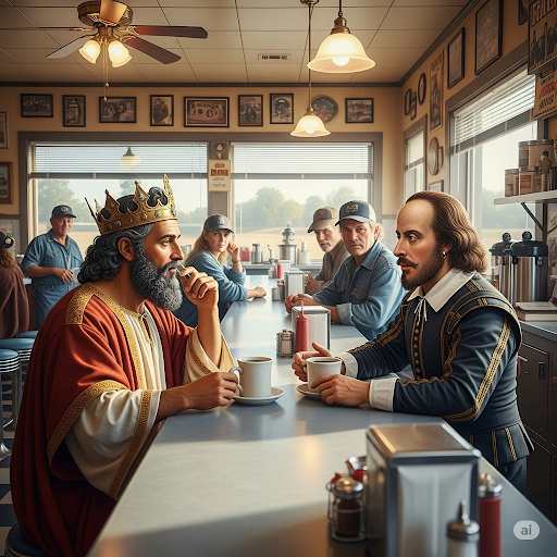 Lucille, having fluttered by from her nearby perch, where she effortlessly eavesdrops on every conversation in every corner of the diner, which is her other superpower to go along with impeccable coffee top-off timing, says, “You knuckleheads were dragging poor defenseless geniuses from bygone eras—Solomon and Shakespeare no less—into your trifling about whether life has meaning and we still ain’t decided and here you are quitting on the subject.”