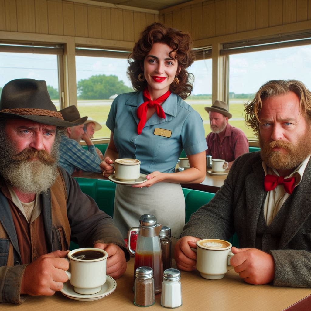 Billy Wayne and Joe Eddy are characters inspired by two men I saw one morning while having coffee with my grandfather. Billy Wayne is a tall, rugged Texas farmer, and Joe Eddie is a stout, meaty businessman. Lucille the Waitress could easily fit into any roadside diner. Since they are fictional, I reserve the right to put them into any era, but always in the morning over coffee with Lucille attending to them. Here is the first in the series, if you want context.